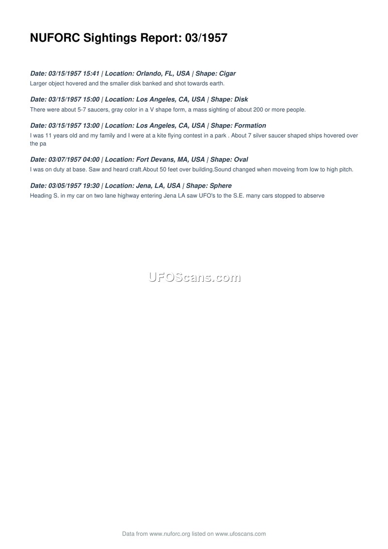 This document, titled 'NUFORC Sightings Report: 03/1957', provides a chronological list of five distinct unidentified aerial phenomena sightings reported during March 1957 within the United States. The reports span various locations, including Orlando, Florida; Los Angeles, California; Fort Devans, Massachusetts; and Jena, Louisiana. The sightings describe a variety of shapes, including cigars, disks, formations, ovals, and spheres. Notable details include a mass sighting in Los Angeles involving approximately 200 people observing gray saucers in a V-formation, and a report from Fort Devans where a witness on duty at a base observed a craft approximately 50 feet above a building, noting a change in sound pitch. Another report from Jena, Louisiana, describes multiple cars stopping on a highway to observe UFOs to the southeast. The document serves as a compilation of these accounts as recorded by the National UFO Reporting Center.
