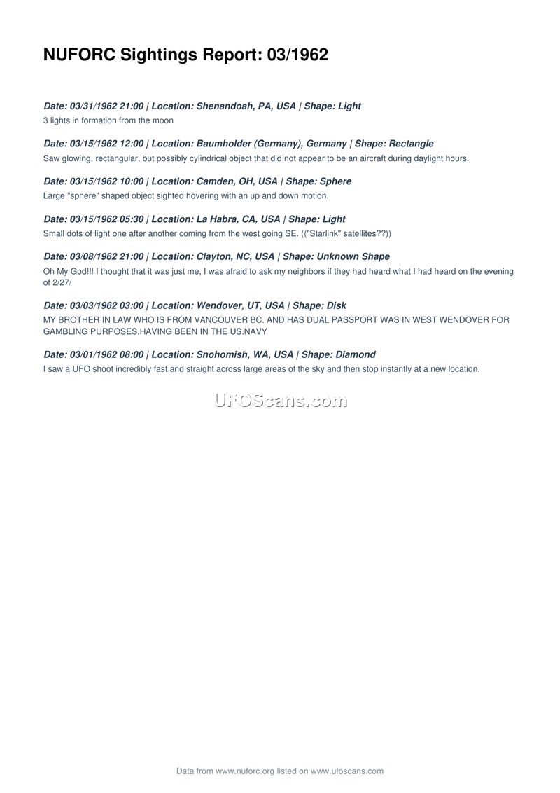 This document is a compilation of seven UFO sighting reports recorded by the National UFO Reporting Center (NUFORC) for the month of March 1962. The reports span various locations, including the United States and Germany. The sightings describe a variety of phenomena, including lights in formation, a glowing rectangular or cylindrical object, a large sphere, small dots of light, an unknown shape, a disk, and a diamond-shaped object. The reports include brief descriptions of the events, such as an object moving with an up and down motion, objects moving at high speeds, and one witness mentioning a relative who served in the US Navy. The document serves as a historical record of reported aerial anomalies during this period.