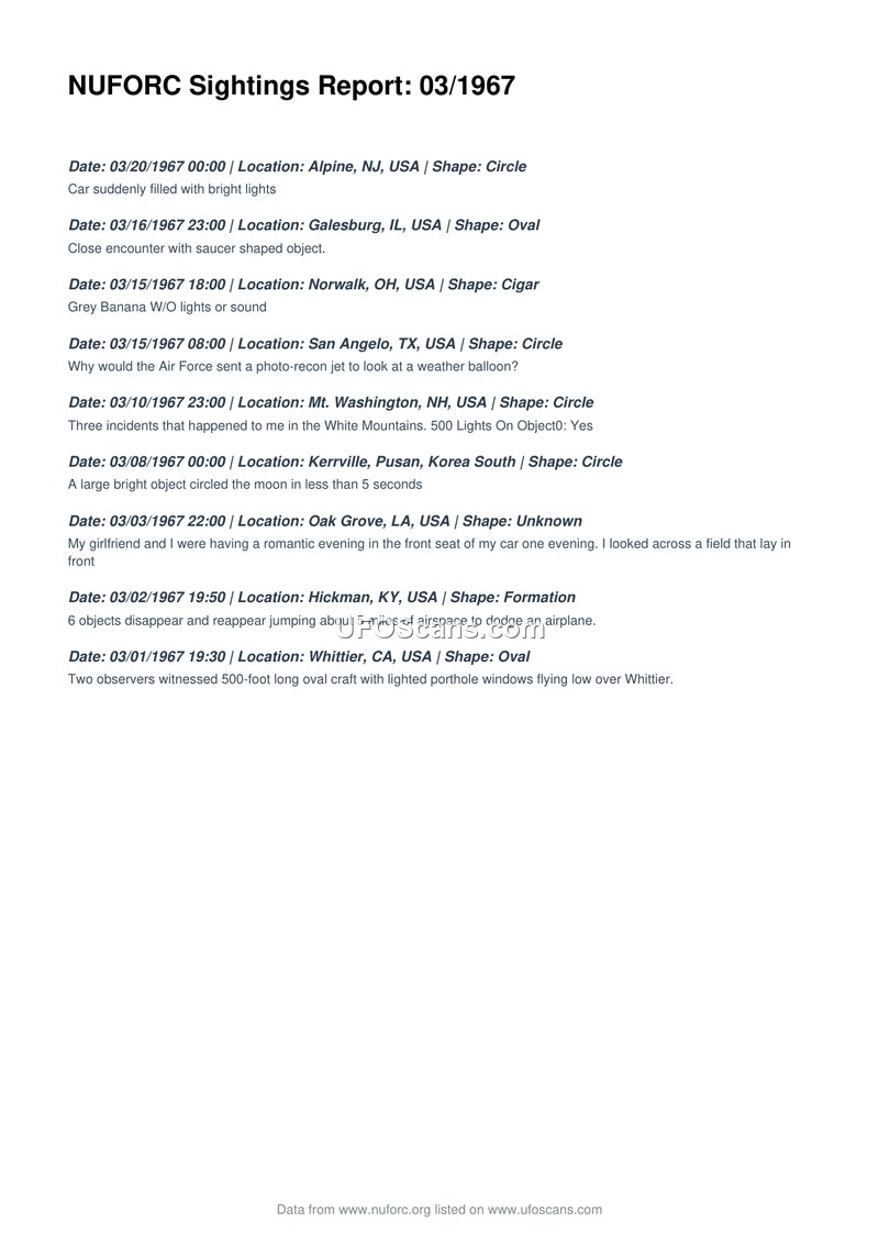 This document lists nine distinct UFO sightings reported to NUFORC during March 1967. It provides brief descriptions of the events, locations, and shapes of the objects observed.