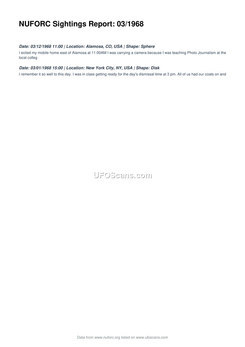 This document is a compilation of two sighting reports from March 1968, sourced from the National UFO Reporting Center (NUFORC). The first incident occurred on March 12, 1968, in Alamosa, Colorado, where a witness observed a spherical object while exiting their mobile home. The witness, who was a photojournalism instructor, noted they were carrying a camera at the time. The second incident took place on March 1, 1968, in New York City, New York. The witness reported observing a disk-shaped object while in a classroom preparing for dismissal at 3:00 PM.