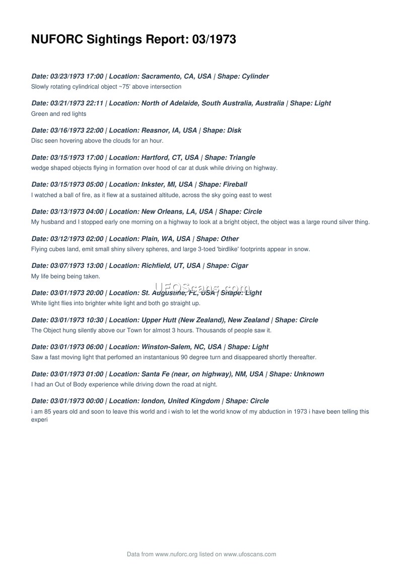 This document is a compilation of UFO sightings reported to the National UFO Reporting Center (NUFORC) during the month of March 1973. The report lists thirteen distinct incidents occurring across various locations, including the United States, Australia, New Zealand, and the United Kingdom. The sightings describe a wide variety of phenomena, ranging from simple lights and circular objects to more complex reports involving cylindrical craft, disc-shaped objects, and triangular formations. Several reports include specific behavioral details, such as a fast-moving light performing a 90-degree turn in Winston-Salem, North Carolina, and flying cubes in Plain, Washington, which reportedly emitted small silvery spheres and left three-toed birdlike footprints in the snow. Other accounts involve personal experiences, such as an out-of-body experience in Santa Fe, New Mexico, and a claim of abduction in London, United Kingdom. The reports vary in their level of detail, with some providing specific times and descriptions of movement, while others, such as the entry for Richfield, Utah, provide only a brief, cryptic statement regarding the witness's life being taken. The document serves as a chronological record of public reports submitted to the organization during this period.