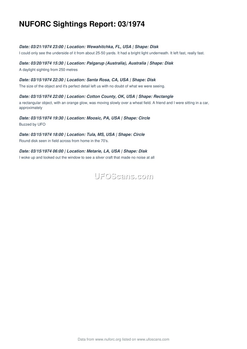 This document is a compilation of UFO sighting reports from March 1974, published by the National UFO Reporting Center (NUFORC). The report lists seven distinct incidents occurring between March 15 and March 21, 1974. The locations span various regions, including Wewahitchka, Florida; Palgarup, Australia; Santa Rosa, California; Cotton County, Oklahoma; Moosic, Pennsylvania; Tula, Mississippi; and Metarie, Louisiana. The reported objects vary in shape, including disks, a rectangle, and circles. Witness descriptions include observations of bright lights, orange glows, silver craft, and silent movement. One report mentions a daylight sighting at a distance of 250 meters, while another describes an object moving slowly over a wheat field. The document serves as a historical record of these specific civilian-reported encounters.