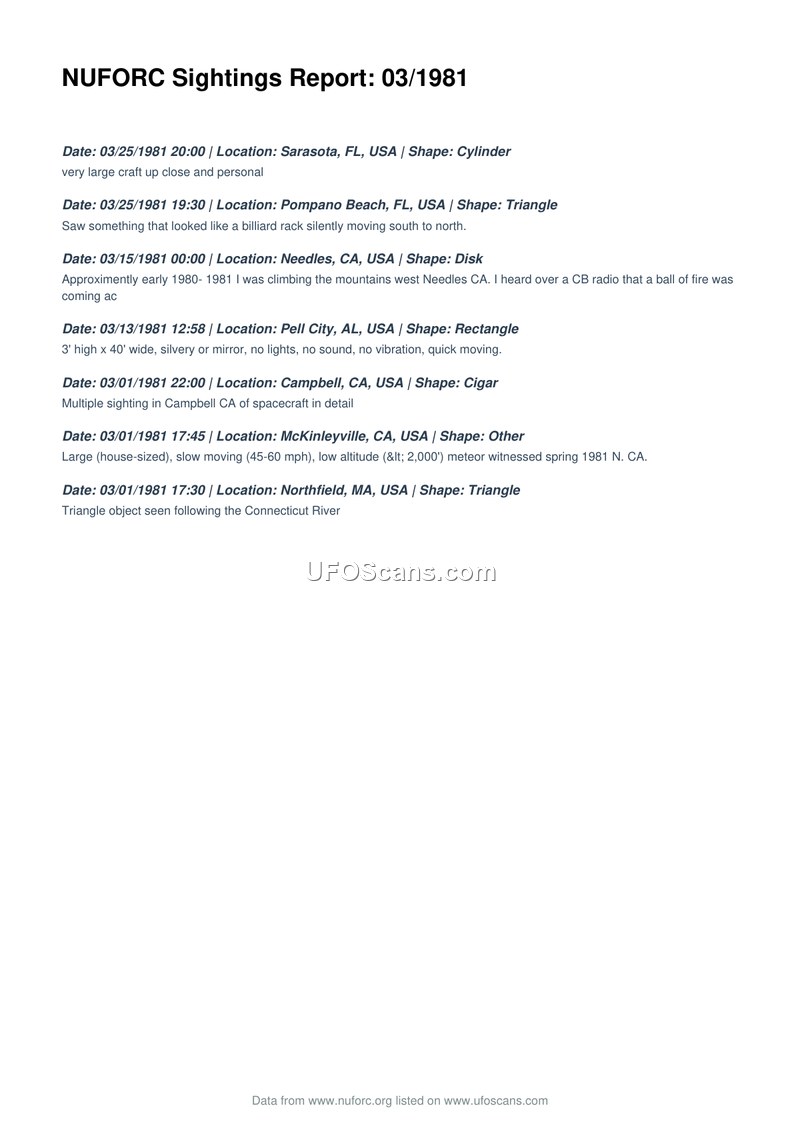This document provides a summary of seven UFO sightings reported to NUFORC in March 1981 across various locations in the United States. It serves as a historical record of civilian-reported aerial phenomena.