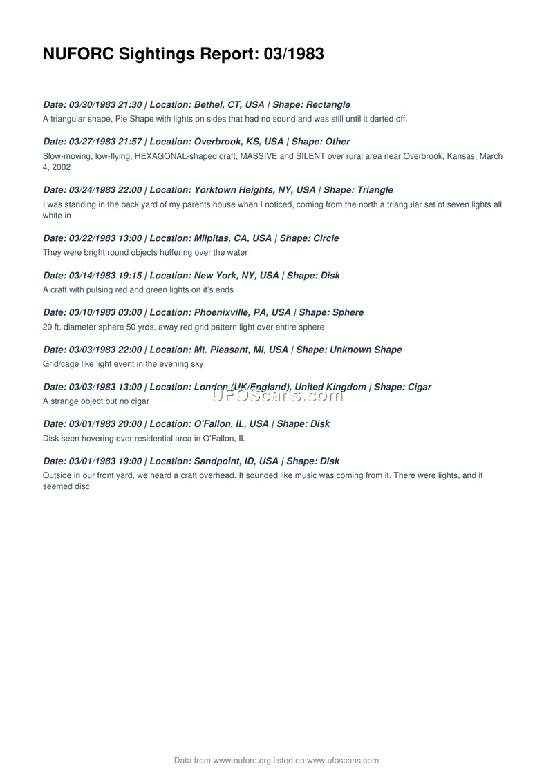 This document provides a list of ten UFO sightings reported to NUFORC during March 1983. It details various shapes, locations, and witness descriptions of aerial phenomena.