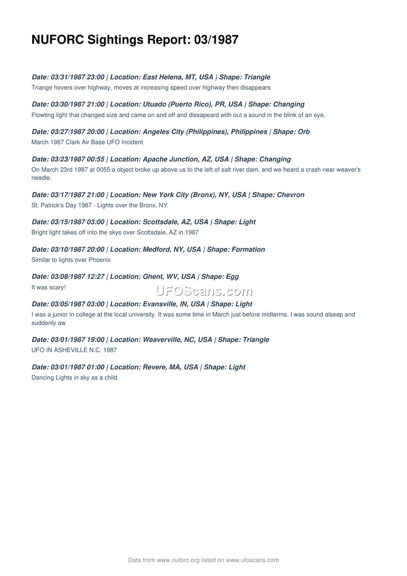 This document is a compilation of eleven UFO sighting reports recorded by the National UFO Reporting Center (NUFORC) for the month of March 1987. The reports span various locations, including the United States (Montana, Puerto Rico, Arizona, New York, West Virginia, Indiana, North Carolina, and Massachusetts) and the Philippines. The sightings describe a variety of phenomena, including objects identified as triangles, orbs, chevrons, eggs, formations, and lights. Specific incidents include a triangle hovering over a highway in East Helena, Montana; a light that changed size and disappeared in Utuado, Puerto Rico; an object breaking up near the Salt River Dam in Apache Junction, Arizona; and lights observed over the Bronx, New York, on St. Patrick's Day. Other reports mention a bright light in Scottsdale, Arizona; a formation of lights in Medford, New York; an egg-shaped object in Ghent, West Virginia; a light observed by a college student in Evansville, Indiana; a triangle in Weaverville, North Carolina; and dancing lights observed by a child in Revere, Massachusetts. The document serves as a chronological log of these civilian-reported events.