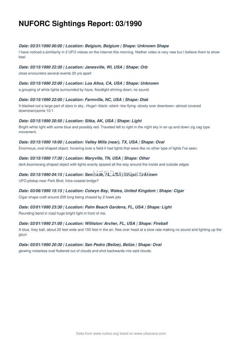 This document is a compilation of UFO sightings reported to the National UFO Reporting Center (NUFORC) during the month of March 1990. The report lists twelve distinct incidents occurring between March 1st and March 31st, 1990. The sightings span various locations, including the United States (Wisconsin, California, North Carolina, Alaska, Texas, Tennessee, and Florida), Belgium, the United Kingdom (Wales), and Belize. The reported phenomena vary significantly in description. Witnesses reported diverse shapes, including orbs, disks, lights, ovals, boomerangs, cigars, and fireballs. Descriptions of behavior include hovering, low-altitude flight, zig-zag movement, and, in one instance in Wales, a cigar-shaped craft being pursued by two hawk jets. Other reports describe silent flight, objects blocking out stars, and objects appearing or disappearing into clouds. One entry references the existence of UFO videos on the internet, noting that while they are not new, they are considered relevant by the reporter. The document serves as a chronological log of these civilian reports, providing brief descriptions of the visual characteristics and behaviors observed by witnesses during this period.