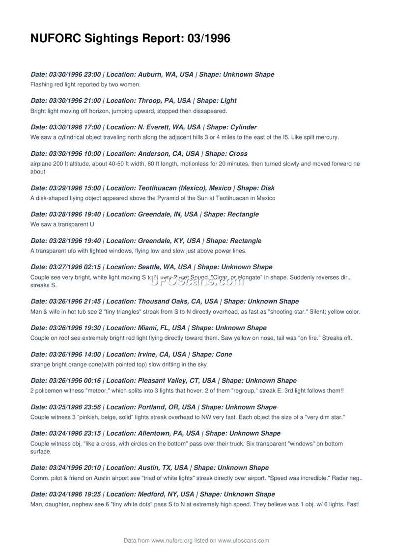 This document is a chronological compilation of Unidentified Aerial Phenomena (UAP) sighting reports recorded by the National UFO Reporting Center (NUFORC) during the month of March 1996. The reports span a wide geographic range, primarily within the United States, but also including sightings in Mexico, the United Kingdom, and Guatemala. The accounts provided by witnesses describe a diverse array of phenomena, ranging from simple lights and geometric shapes—such as cylinders, disks, triangles, and cones—to more complex observations involving multiple objects, formation flying, and sudden, high-speed maneuvers. Many reports highlight the silent nature of the objects, while others note specific physical characteristics like flashing lights, metallic surfaces, or transparent windows. Several accounts involve multiple witnesses, including law enforcement officers, commercial pilots, and federal employees, adding a layer of reported credibility to the observations. Some entries mention specific behaviors, such as hovering, rapid acceleration, sudden changes in direction, and instances of objects appearing to split or merge. A few reports include anecdotal details regarding potential physiological effects or lost time, while others note the presence of military aircraft in the vicinity of the sightings. The document serves as a raw data repository, capturing the subjective experiences of the public as reported to the NUFORC during this period.