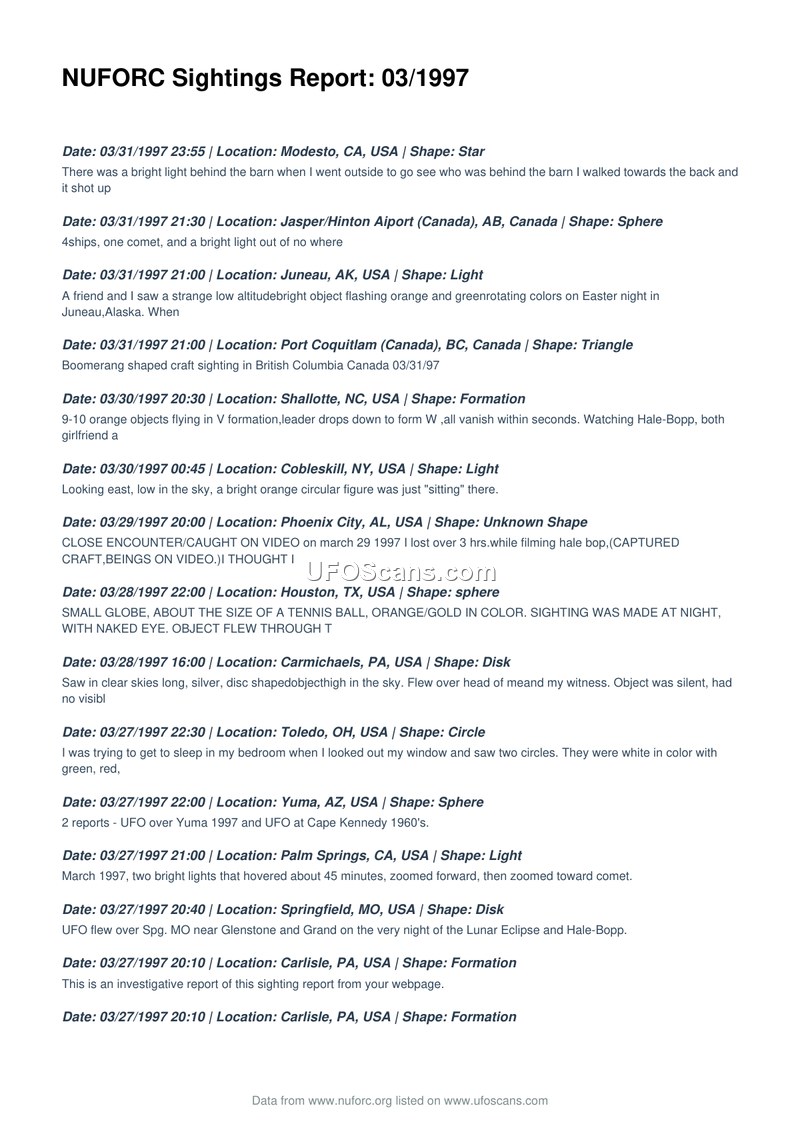 This document is a compilation of hundreds of individual UFO sighting reports submitted to NUFORC during March 1997. It is particularly notable for its extensive documentation of the Phoenix Lights event on March 13, 1997.