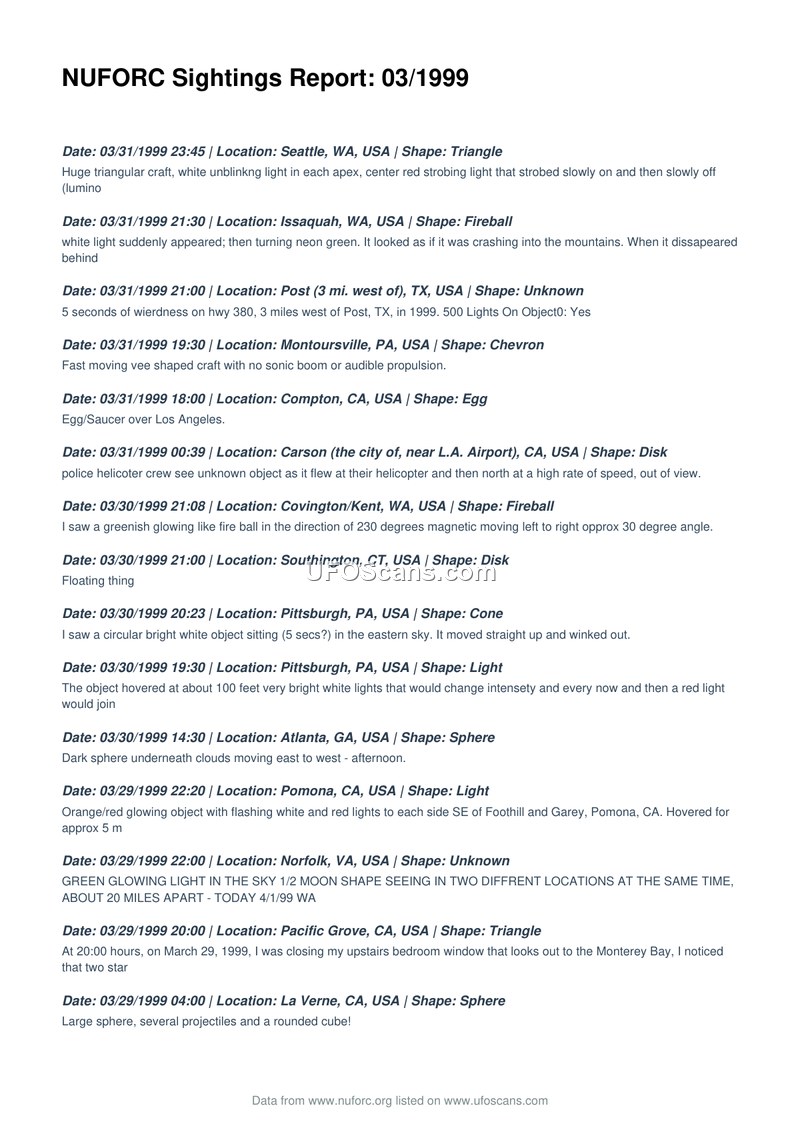 This document is a chronological compilation of UFO sighting reports submitted to the National UFO Reporting Center during March 1999. It documents a wide variety of aerial phenomena reported by witnesses across the United States and several other countries.