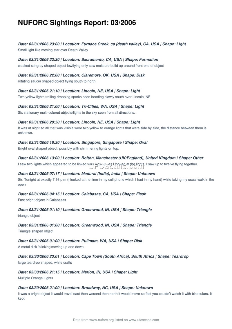 This document is a monthly compilation of public UFO sighting reports from March 2006, collected by the National UFO Reporting Center. It provides a global snapshot of diverse aerial phenomena reported by civilians, ranging from simple lights to complex geometric craft.
