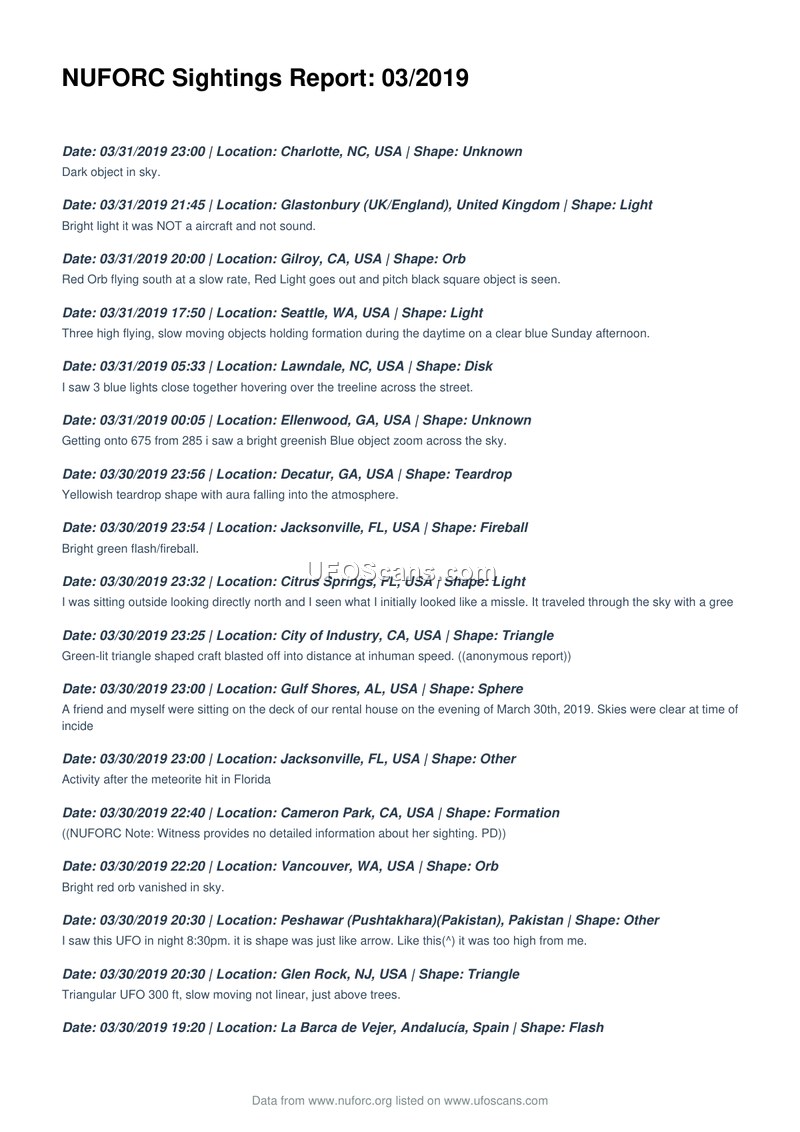 NUFORC Sightings Report: 03/2019