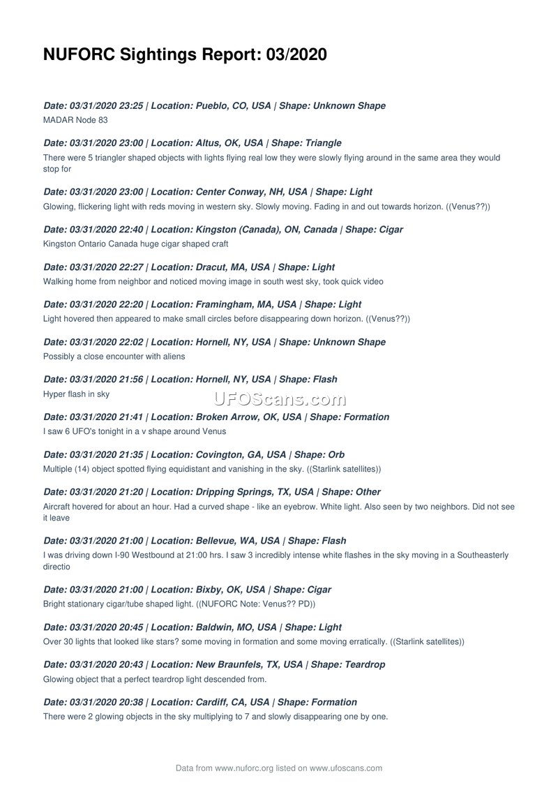 This document is a comprehensive compilation of UFO/UAP sighting reports submitted to the National UFO Reporting Center (NUFORC) for the month of March 2020. The report consists of 49 pages of individual entries, each detailing a specific sighting event. The entries are organized chronologically, beginning with reports from March 31, 2020, and extending back through the month to March 1, 2020. Each entry typically includes the date, time, location, and a brief description of the observed object or phenomenon, along with its reported shape. The descriptions vary significantly, ranging from simple lights and flashes to more complex shapes such as triangles, cigars, orbs, disks, and formations. A recurring theme throughout the document is the frequent mention of 'Starlink' satellites, which are often cited by witnesses or noted by NUFORC as a potential explanation for sightings involving strings or lines of lights moving in formation. Other common descriptors include 'formation,' 'light,' 'circle,' 'sphere,' and 'unknown shape.' Some reports include additional context, such as the use of MADAR nodes for monitoring, or personal anecdotes from witnesses regarding their observations. The document serves as a raw data repository for public-submitted reports, reflecting a wide variety of aerial phenomena observed across the United States, Canada, and occasionally other international locations. The reports are presented without formal investigation or official conclusion, acting as a historical record of public observations during this specific timeframe.