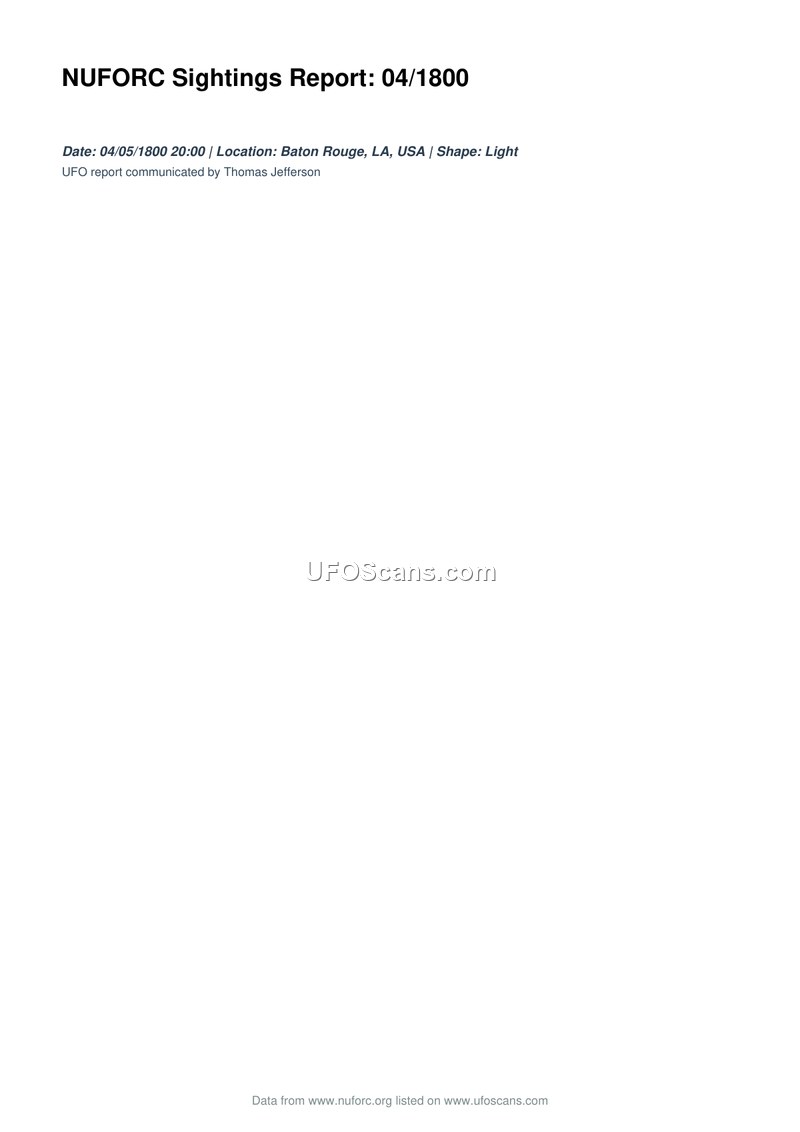 This document is a brief sighting report cataloged by the National UFO Reporting Center (NUFORC). It details an event that occurred on April 5, 1800, at 20:00 in Baton Rouge, Louisiana. The object observed is described simply as a 'Light.' The report notes that the information was communicated by Thomas Jefferson.