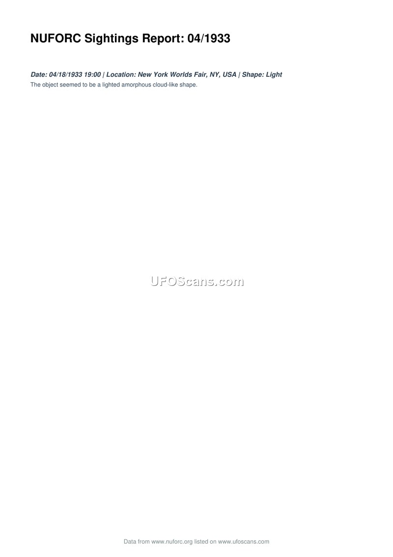 A report of a sighting of a lighted, amorphous cloud-like object at the New York Worlds Fair on April 18, 1933. The data is provided by the National UFO Reporting Center.