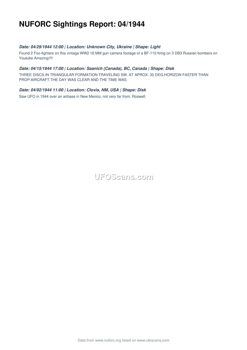 This document lists three UFO sightings from April 1944 in Ukraine, Canada, and the United States. It includes reports of 'Foo-fighters' in combat footage and disc-shaped objects observed in flight.