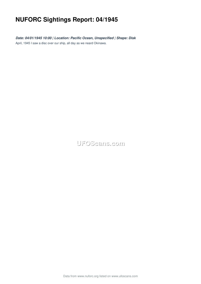 This document is a sighting report from the National UFO Reporting Center (NUFORC) regarding an event that occurred on April 1, 1945. The witness reports observing a disc-shaped object while at sea in the Pacific Ocean. The object was reportedly visible over the witness's ship for the duration of the day as the vessel approached Okinawa.