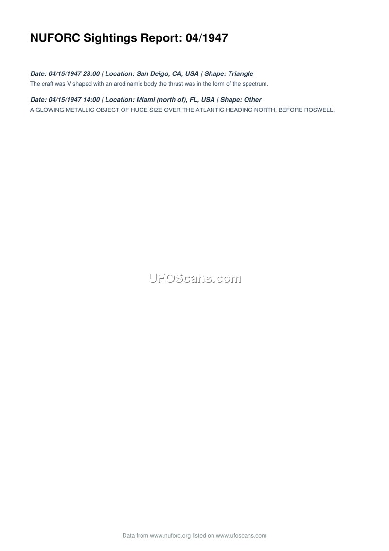 This document, titled 'NUFORC Sightings Report: 04/1947', provides a brief summary of two separate aerial phenomena reported on April 15, 1947. The first incident occurred at 23:00 in San Deigo, California, involving a V-shaped craft described as having an aerodynamic body and thrust in the form of the spectrum. The second incident occurred earlier that day at 14:00, north of Miami, Florida, involving a huge, glowing, metallic object observed over the Atlantic Ocean heading north. The document notes that this second sighting occurred before the Roswell incident.