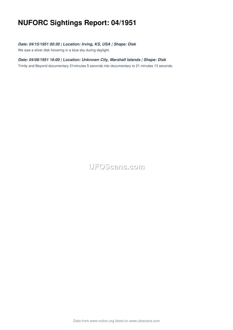 This document, titled 'NUFORC Sightings Report: 04/1951', provides a brief summary of two separate unidentified aerial phenomena sightings reported to the National UFO Reporting Center. The first incident occurred on April 15, 1951, at 00:30 in Irving, Kansas, where witnesses observed a silver disk hovering in a blue sky during daylight hours. The second incident took place on April 8, 1951, at 16:00 in an unknown city within the Marshall Islands. This second report references a specific segment of the 'Trinity and Beyond' documentary, spanning from 21 minutes and 5 seconds to 21 minutes and 13 seconds, as the source of the sighting information.