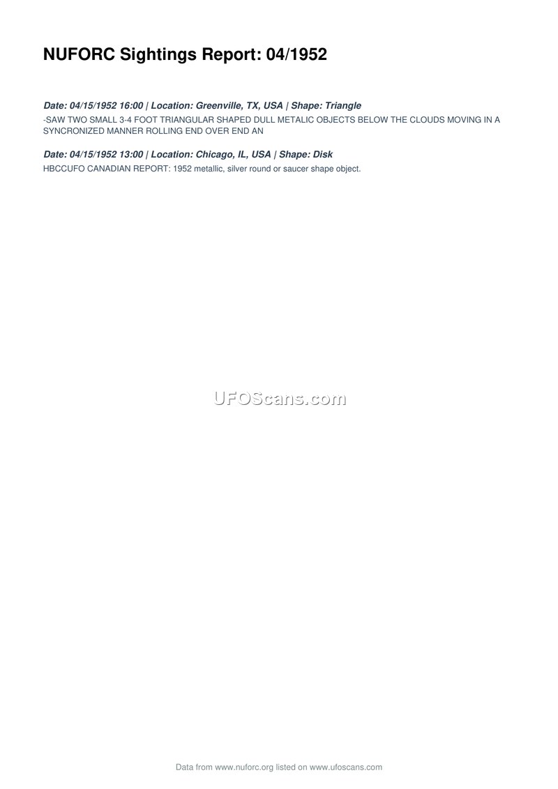 This document provides a summary of two UFO sightings reported in April 1952. The first incident occurred on April 15, 1952, at 16:00 in Greenville, Texas. The witness reported observing two small, 3-4 foot triangular-shaped, dull metallic objects positioned below the clouds. These objects were described as moving in a synchronized manner while rolling end over end. The second incident occurred on the same day, April 15, 1952, at 13:00 in Chicago, Illinois. This report, attributed to an HBCCUFO Canadian report, describes a metallic, silver, round or saucer-shaped object.