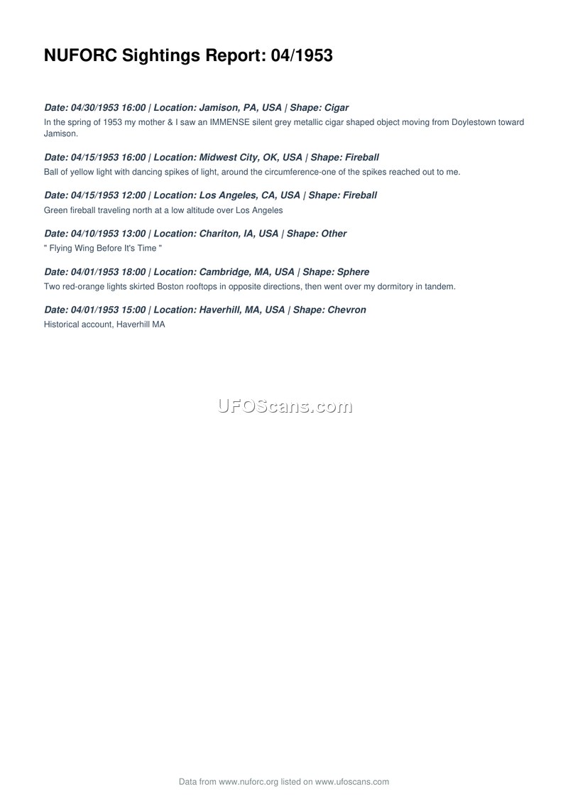 This document is a compilation of UFO sighting reports from April 1953, provided by the National UFO Reporting Center (NUFORC). The report lists six distinct incidents across the United States. On April 30, 1953, in Jamison, Pennsylvania, a witness and their mother observed an immense, silent, grey, metallic, cigar-shaped object moving from Doylestown toward Jamison. On April 15, 1953, in Midwest City, Oklahoma, a witness reported a ball of yellow light with dancing spikes of light around its circumference, one of which appeared to reach toward the observer. On the same day in Los Angeles, California, a green fireball was observed traveling north at a low altitude. On April 10, 1953, in Chariton, Iowa, an object described as a 'Flying Wing' was reported. On April 1, 1953, in Cambridge, Massachusetts, two red-orange lights were seen skirting Boston rooftops in opposite directions before passing over a dormitory in tandem. Finally, on April 1, 1953, in Haverhill, Massachusetts, a chevron-shaped object was reported as a historical account.