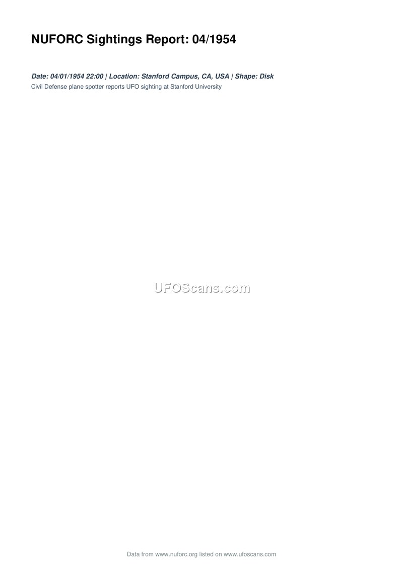 A Civil Defense plane spotter reported a disk-shaped UFO over Stanford University on April 1, 1954. This report is cataloged by the National UFO Reporting Center.