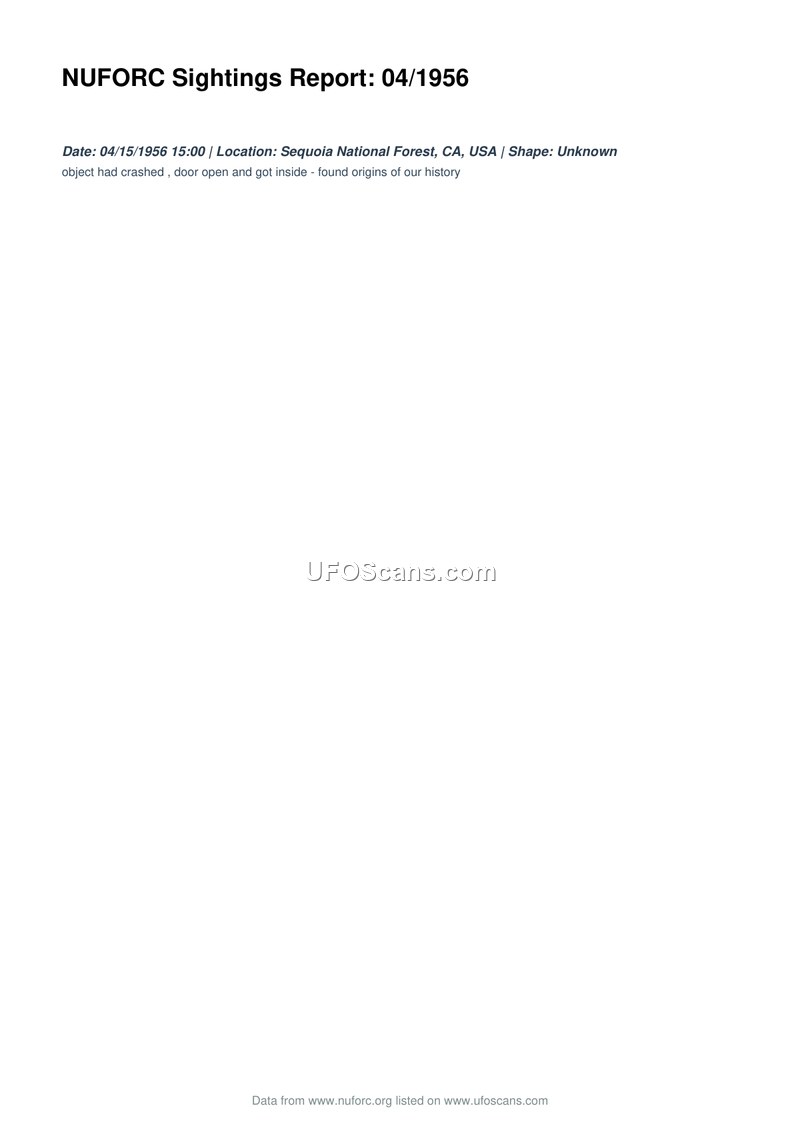 This document is a brief sighting report from the National UFO Reporting Center (NUFORC) regarding an incident that occurred on April 15, 1956, at 15:00 hours. The location of the event is identified as the Sequoia National Forest in California, USA. The report describes an unidentified object that had crashed. According to the text, the object had its door open, and the observer gained access to the interior, claiming to have found the origins of human history.