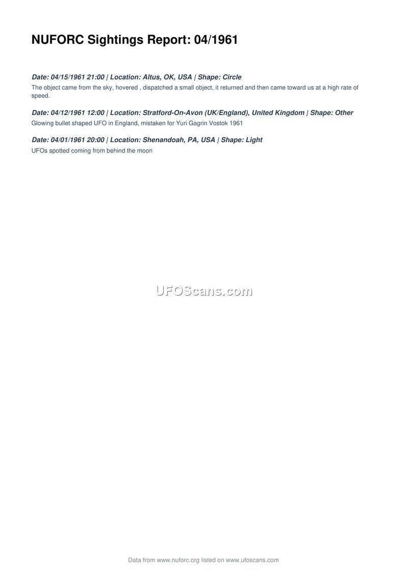 This document, titled 'NUFORC Sightings Report: 04/1961', provides a brief summary of three distinct unidentified aerial phenomena sightings reported during April 1961. The first incident occurred on April 15, 1961, at 21:00 in Altus, Oklahoma, USA. The witness described a circular object that emerged from the sky, hovered, and dispatched a smaller object before the primary craft returned and accelerated toward the observers at a high rate of speed. The second incident took place on April 12, 1961, at 12:00 in Stratford-On-Avon, United Kingdom. This sighting involved a glowing, bullet-shaped object that was reportedly mistaken for the Vostok 1961 spacecraft piloted by Yuri Gagarin. The final incident listed occurred on April 1, 1961, at 20:00 in Shenandoah, Pennsylvania, USA, where observers reported seeing UFOs emerging from behind the moon.