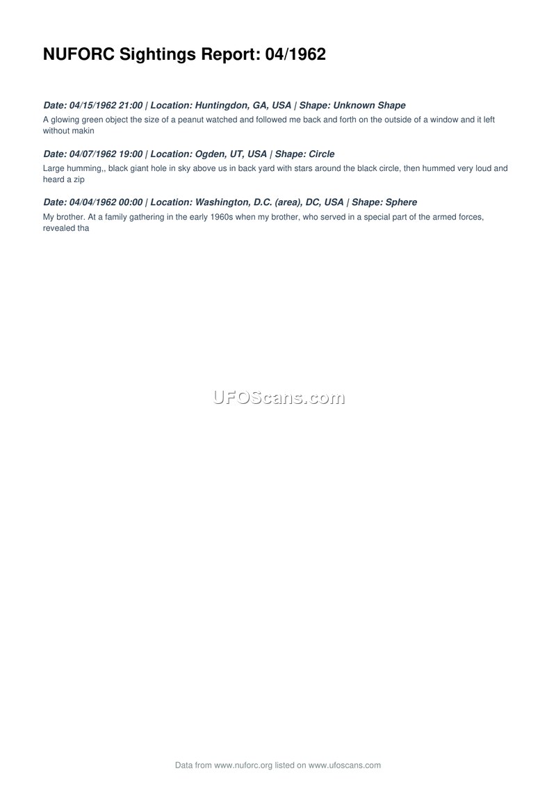 This document is a compilation of three separate UFO sighting reports from April 1962, sourced from the National UFO Reporting Center (NUFORC). The first report, dated April 15, 1962, in Huntingdon, Georgia, describes a glowing green object, approximately the size of a peanut, that followed the witness back and forth outside a window. The second report, dated April 7, 1962, in Ogden, Utah, describes a large, humming, black hole in the sky surrounded by stars, which emitted a loud humming sound followed by a 'zip' noise. The third report, dated April 4, 1962, in the Washington, D.C. area, mentions a witness's brother who served in a special part of the armed forces and revealed information during a family gathering in the early 1960s; however, the text of this report is incomplete.