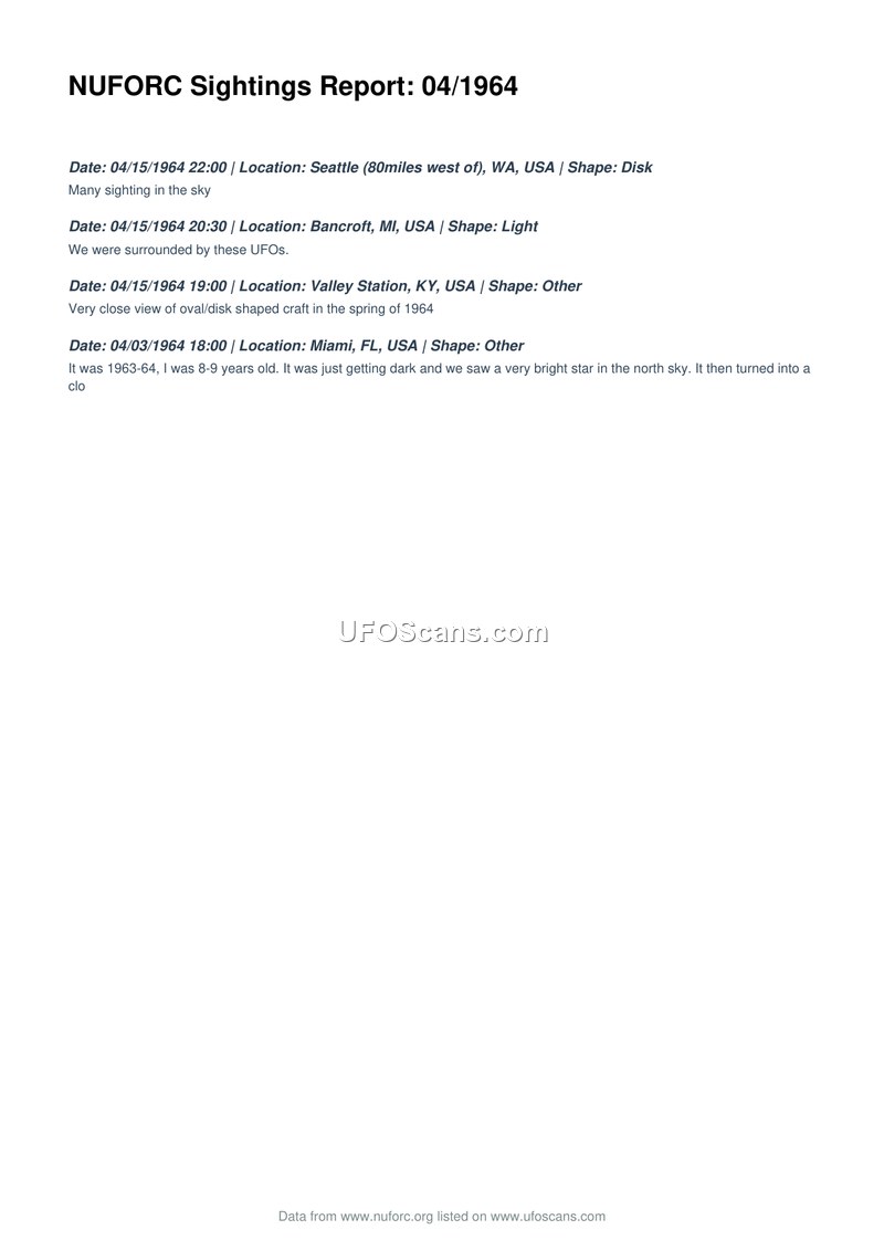 This document is a compilation of UFO sightings reported to the National UFO Reporting Center (NUFORC) for the month of April 1964. It lists four distinct incidents. The first occurred on April 15, 1964, at 22:00, 80 miles west of Seattle, Washington, involving a disk-shaped object described as 'many sighting in the sky.' The second incident took place on April 15, 1964, at 20:30 in Bancroft, Michigan, where the witness reported being 'surrounded by these UFOs' described as lights. The third incident occurred on April 15, 1964, at 19:00 in Valley Station, Kentucky, involving an oval or disk-shaped craft. The final entry is dated April 3, 1964, at 18:00 in Miami, Florida, where a witness recalls an event from 1963-64 involving a very bright star in the north sky that transformed into another object, though the text is cut off.