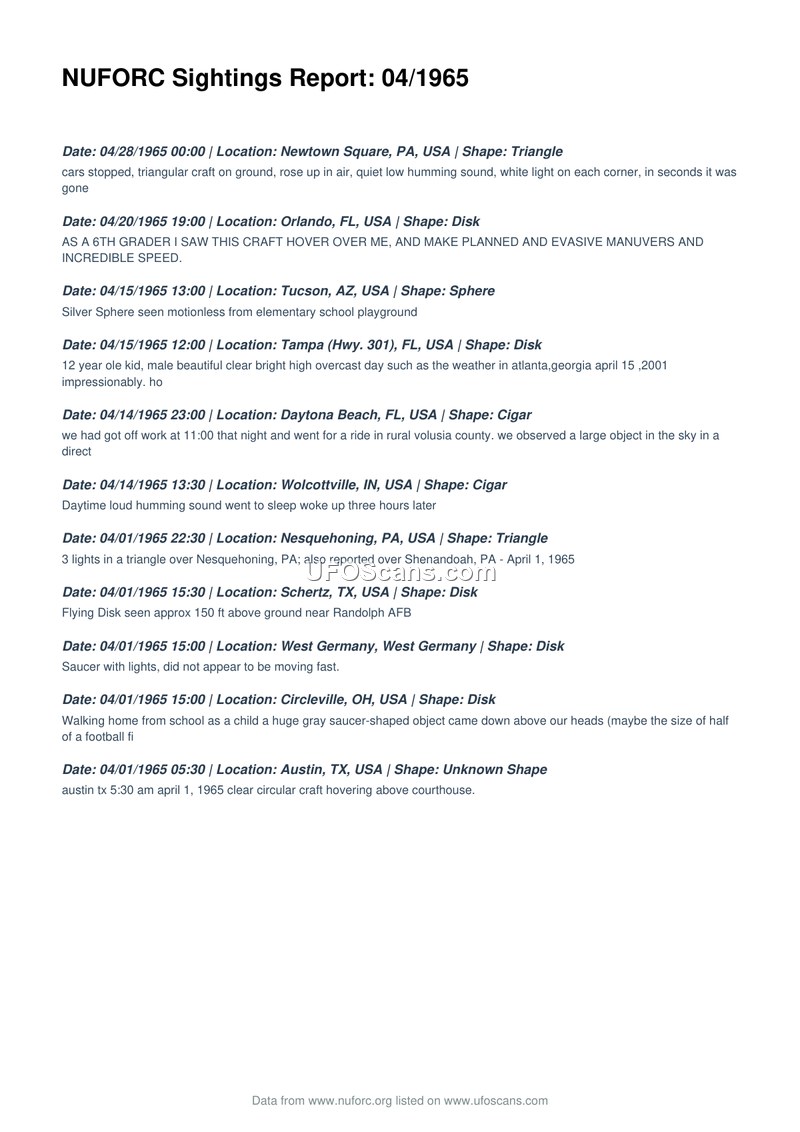 This document is a compilation of unidentified aerial phenomena sightings reported to the National UFO Reporting Center (NUFORC) for the month of April 1965. The report lists eleven distinct incidents occurring between April 1 and April 28, 1965. The locations of these sightings span across the United States, including Pennsylvania, Florida, Arizona, Indiana, Texas, and Ohio, as well as one report from West Germany. The reported objects vary in shape, including triangles, disks, spheres, and cigars. Witness accounts describe a range of behaviors, such as hovering, evasive maneuvers, and low-altitude flight. Specific details include a report of a triangular craft on the ground in Newtown Square, Pennsylvania, which emitted a low humming sound, and a disk-shaped object observed near Randolph Air Force Base in Texas. Another witness in Circleville, Ohio, described a large, gray, saucer-shaped object appearing above their head while walking home from school. The document serves as a chronological record of these civilian-reported events, providing brief descriptions of the phenomena observed.