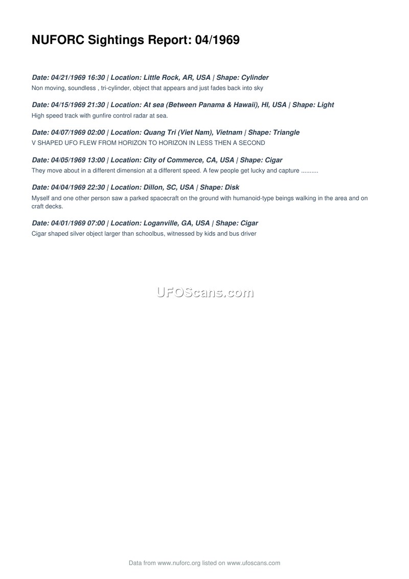 This document is a compilation of UFO sightings reported to the National UFO Reporting Center (NUFORC) for the month of April 1969. It lists six distinct incidents occurring between April 1 and April 21, 1969. The reports span various locations, including Little Rock, Arkansas; the Pacific Ocean between Panama and Hawaii; Quang Tri, Vietnam; the City of Commerce, California; Dillon, South Carolina; and Loganville, Georgia. The reported phenomena vary in description, including a tri-cylinder object, a light tracked by gunfire control radar, a V-shaped object, a cigar-shaped object, a disk with humanoid-type beings, and a large silver cigar-shaped object. The document provides brief descriptions of the behavior and characteristics of these objects as reported by witnesses.