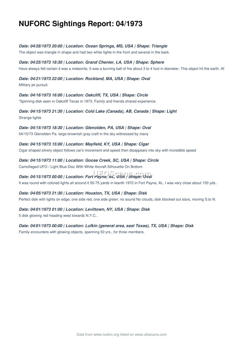 This document is a compilation of UFO sightings reported to the National UFO Reporting Center (NUFORC) for the month of April 1973. The report lists twelve distinct incidents occurring across the United States and Canada. The sightings describe a variety of shapes, including triangles, spheres, ovals, circles, cigars, and disks. Notable reports include a military jet pursuit in Rockland, Massachusetts, on April 21; a cigar-shaped object in Mayfield, Kentucky, on April 15 that followed a car; and a camouflaged disc in Goose Creek, South Carolina, also on April 15. Other reports detail specific physical characteristics, such as colored lights, silent movement, and the ability to block out stars. One report from Grand Chenier, Louisiana, describes a burning ball of fire that hit the earth, which the witness believed to be a meteorite. Another report from Lufkin, Texas, notes a family history of encounters spanning fifty years. The document serves as a chronological log of these reported phenomena.