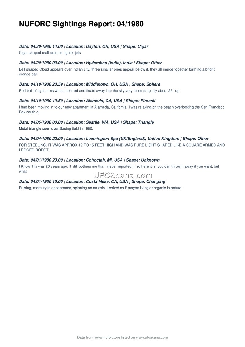This document is a compilation of UFO sighting reports from April 1980, sourced from the National UFO Reporting Center (NUFORC). It lists eight distinct incidents occurring between April 1 and April 20, 1980. The reports span various locations, including Dayton, Ohio; Hyderabad, India; Middletown, Ohio; Alameda, California; Seattle, Washington; Leamington Spa, United Kingdom; Cohoctah, Michigan; and Costa Mesa, California. The descriptions of the phenomena vary significantly, ranging from a cigar-shaped craft reported to have outrun fighter jets in Dayton, to a bell-shaped cloud formation in Hyderabad that merged into a bright orange ball. Other reports include a red ball of light in Middletown, a fireball in Alameda, a metal triangle over Boeing field in Seattle, and a square, robot-like figure made of pure light in Leamington Spa. One report from Cohoctah mentions a sighting from twenty years prior, while a report from Costa Mesa describes a pulsing, mercury-like object that appeared to be spinning on an axis and potentially organic in nature.