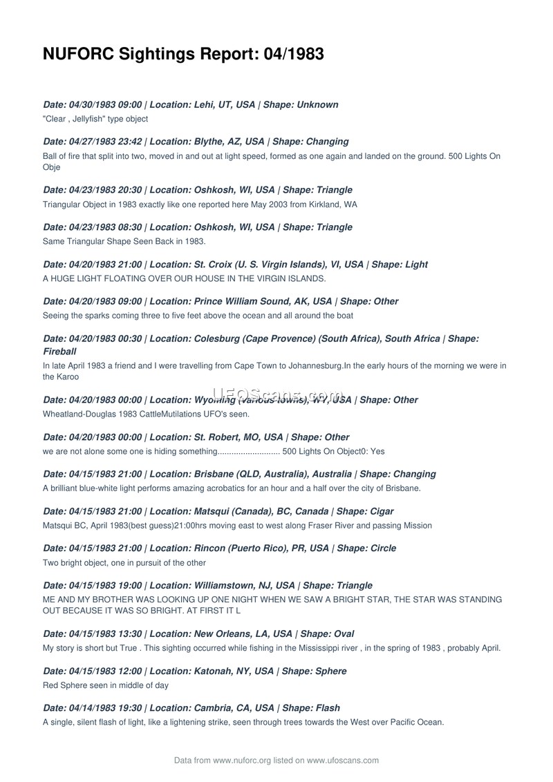 This document is a compilation of UFO sighting reports from April 1983, sourced from the National UFO Reporting Center (NUFORC). The report lists various incidents occurring across the United States, Canada, Australia, South Africa, and Puerto Rico. The sightings describe a wide array of phenomena, including triangular objects, fireballs, spheres, cigars, disks, and unidentified lights. Notable reports include a 'jellyfish' type object in Lehi, Utah; a fireball in South Africa; cattle mutilations associated with UFO sightings in Wyoming; and a mother ship sighting in Albuquerque, New Mexico. Witnesses describe diverse behaviors, such as objects performing acrobatics, hovering, moving at high speeds, and splitting into multiple parts. Some reports mention potential explanations or comparisons, such as Starlink satellites or drones, while others express personal concern or confusion regarding the nature of the observed phenomena. The document serves as a chronological log of these civilian-reported events throughout the month of April 1983.