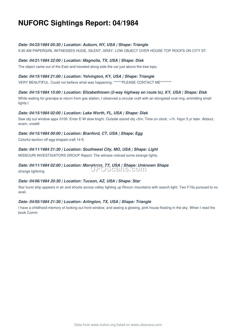 This document is a compilation of UFO sightings reported to the National UFO Reporting Center (NUFORC) for the month of April 1984. The report lists ten distinct incidents across various locations in the United States, including New York, Texas, Kentucky, Florida, Connecticut, Missouri, and Arizona. The sightings describe a variety of objects, including triangles, disks, an egg-shaped craft, a star-like object, and unidentified lights. Notable reports include a witness in Lake Worth, Florida, who reported an abduction and examination experience, and a sighting in Tucson, Arizona, where two F15 aircraft reportedly pursued a star-like object that illuminated the Rincon mountains with a searchlight. Other reports describe silent, low-flying objects, glowing craft, and strange lightning. One entry mentions a report from the Missouri Investigators Group regarding strange lights in Southwest City, Missouri. The document serves as a chronological log of these civilian-reported phenomena.