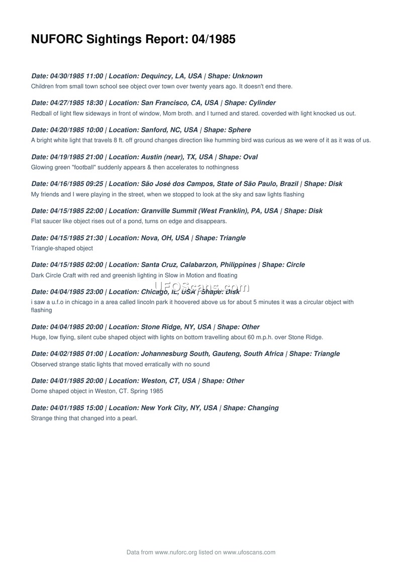 This document provides a chronological list of thirteen UFO sightings reported to NUFORC in April 1985. It documents diverse aerial phenomena observed globally, including various shapes, colors, and behaviors.