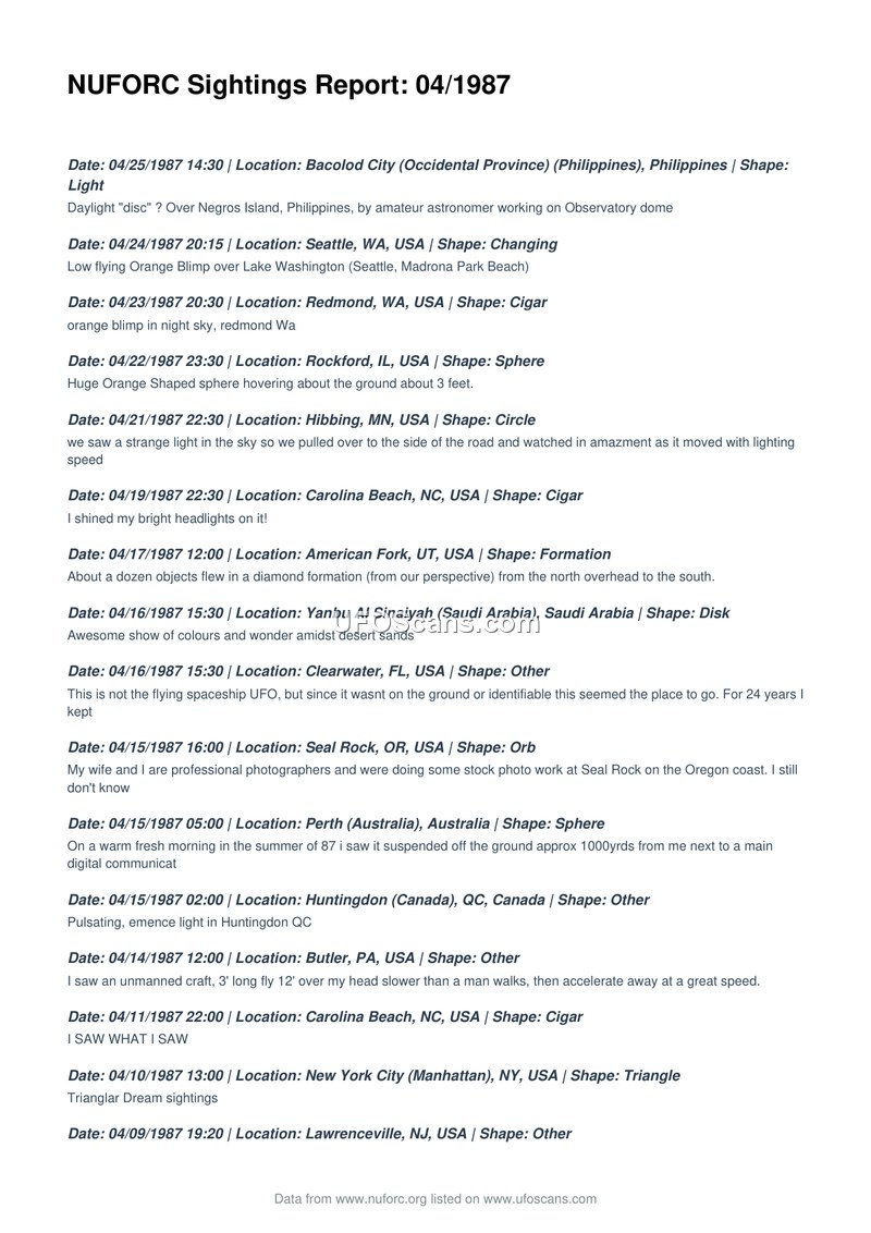 A chronological log of UFO sightings reported to NUFORC in April 1987. It documents diverse aerial phenomena observed globally by various witnesses.