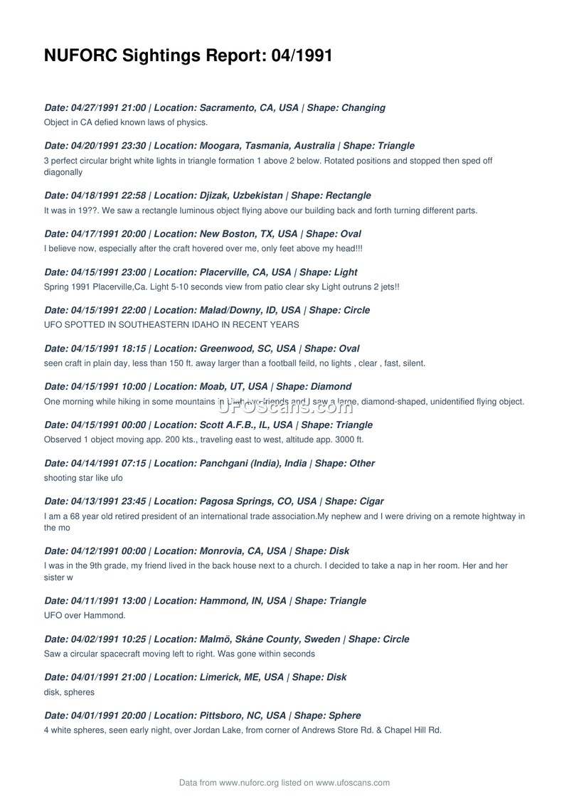 A monthly log of UFO sightings reported to the National UFO Reporting Center in April 1991. It documents diverse aerial phenomena observed across multiple countries.