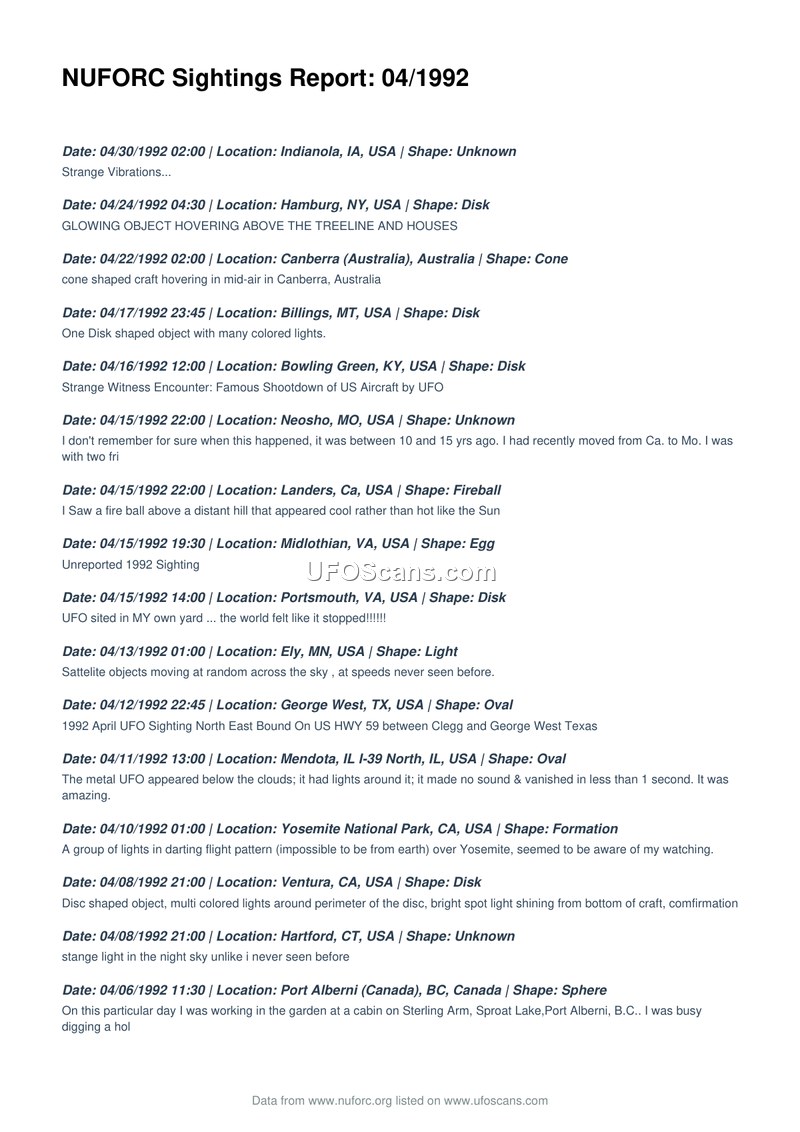 This document is a compilation of UFO sighting reports submitted to the National UFO Reporting Center (NUFORC) for the month of April 1992. The report lists various incidents occurring across the United States, Canada, and Australia. The sightings describe a wide range of phenomena, including glowing objects, disk-shaped craft, fireballs, egg-shaped objects, and formations of lights. Specific reports include a witness in Bowling Green, Kentucky, mentioning a 'famous shootdown of US aircraft by UFO,' and a report from Port Alberni, Canada, where a witness observed a sphere while gardening. Other accounts describe objects with multi-colored lights, rapid movement, and silent flight. Some witnesses reported physical or psychological impacts, such as the feeling that the world had stopped or the observation of lights that seemed aware of the observer. The document serves as a chronological log of these civilian-reported events, providing dates, locations, and brief descriptions of the phenomena observed.
