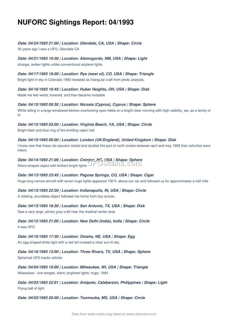 This document is a chronological list of UFO sightings reported to the National UFO Reporting Center during April 1993. It catalogs various aerial phenomena observed globally by civilians.