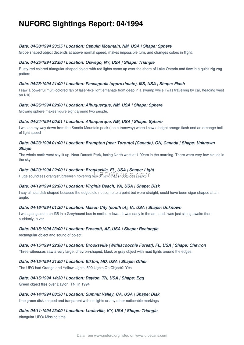 This document is a compilation of Unidentified Aerial Phenomena (UAP) sightings reported to the National UFO Reporting Center (NUFORC) during the month of April 1994. The report lists numerous individual accounts from various locations, primarily within the United States, but also including reports from Canada and Brazil. The sightings describe a wide variety of objects, including spheres, triangles, disks, cigars, eggs, and orbs. Witnesses reported diverse behaviors, such as rapid zig-zag flight patterns, hovering, emitting sparks, changing colors, and in one instance, a 'missing time' event. The reports vary in detail, with some providing specific environmental context, such as sightings near Lake Ontario, the Sandia Mountain peak, or over the Withlacoochee Forest. Several reports mention specific light characteristics, such as 'Kelly green' orbs, orange and yellow lights, and multi-colored laser-like fans. The document serves as a chronological log of these civilian-reported incidents, capturing the subjective experiences of witnesses across different geographic regions during this specific month.