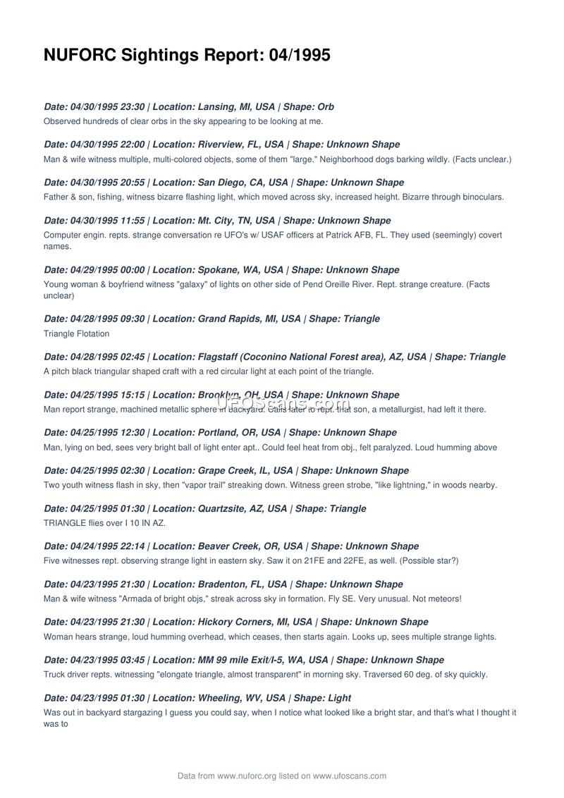 A chronological log of UFO sightings reported to the National UFO Reporting Center during April 1995. It documents a wide range of aerial phenomena observed by the public across the United States.