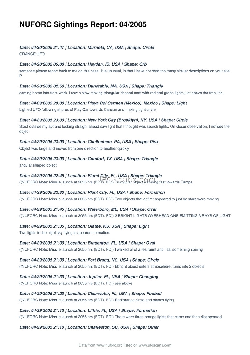 This document is a compilation of sighting reports submitted to the National UFO Reporting Center (NUFORC) for the month of April 2005. The reports span a wide geographic range, including numerous locations across the United States, as well as sightings in Canada, the United Kingdom, Australia, Mexico, New Zealand, Guatemala, Venezuela, Italy, and Romania. The entries are organized chronologically, beginning on April 30, 2005, and extending back through the month to April 1, 2005. Each entry provides the date, time, location, and a brief description of the reported phenomenon, often categorized by the shape of the object observed. Common shapes reported include circles, triangles, orbs, lights, disks, fireballs, and cigars. Many entries include notes from NUFORC, which frequently suggest alternative explanations for the sightings, such as missile launches (specifically noting a launch at 2055 hrs EDT on April 29, 2005), the planet Sirius, satellites, Iridium flares, lens flares, or meteor showers. Some reports describe specific behaviors, such as objects hovering, changing shape, moving in formation, or emitting sounds. Several witnesses mention taking photographs or videos of the objects, and some reports include personal reactions, such as confusion, fear, or excitement. The document serves as a raw data repository for public-submitted accounts of unidentified aerial phenomena during this period.
