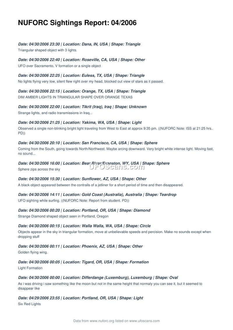 This document is a comprehensive compilation of Unidentified Aerial Phenomena (UAP) sighting reports collected by the National UFO Reporting Center (NUFORC) for the month of April 2006. The report lists hundreds of individual accounts submitted by witnesses from across the globe, including the United States, Canada, the United Kingdom, Australia, South Africa, Mexico, Spain, Israel, India, and Pakistan. Each entry provides the date, time, location, and a brief description of the observed object or phenomenon. The shapes reported are highly varied, including triangles, spheres, disks, cigars, teardrops, orbs, and various light formations. Many witnesses describe objects that exhibit unconventional flight characteristics, such as sudden stops, rapid acceleration, hovering, and silent movement. Some reports mention specific details like multiple lights, color changes, or objects appearing to cloak or disappear instantly. The document also includes occasional editorial notes from NUFORC, which sometimes offer potential explanations for specific sightings, such as the International Space Station (ISS), Iridium satellite flares, or celestial bodies. Other entries are flagged by NUFORC as potential hoaxes or student reports. The accounts range from brief, single-sentence descriptions to more detailed narratives of personal experiences, such as objects seen while driving, flying, or during outdoor activities. The report serves as a raw data repository of public-submitted sightings, reflecting the diverse and often anomalous nature of the phenomena reported to the center during this period.