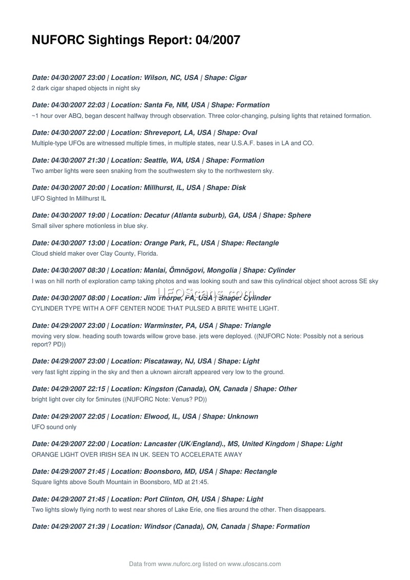 NUFORC Sightings Report: 04/2007