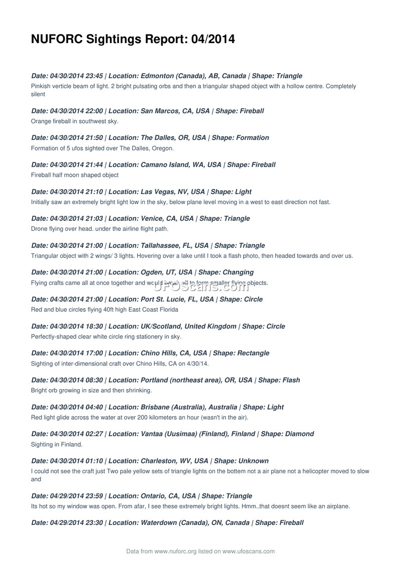 This document is a monthly compilation of hundreds of UAP sighting reports submitted to the National UFO Reporting Center during April 2014. It provides a global record of witness accounts detailing various shapes, behaviors, and characteristics of observed aerial phenomena.