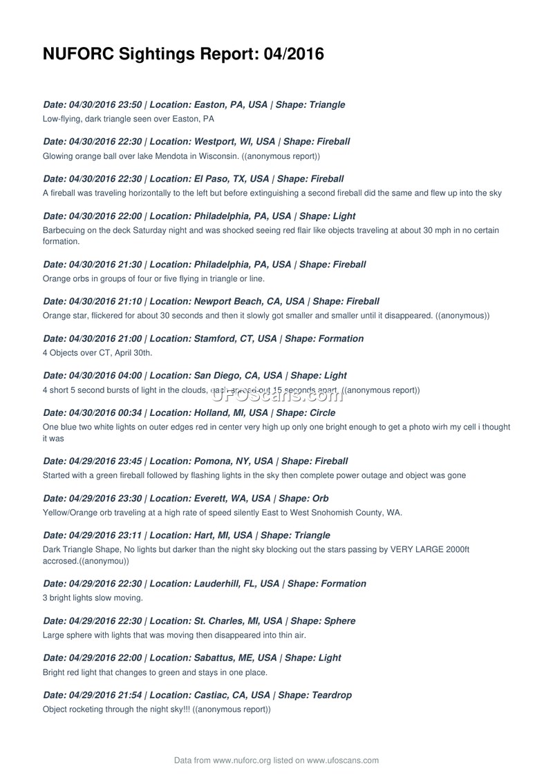 NUFORC Sightings Report: 04/2016