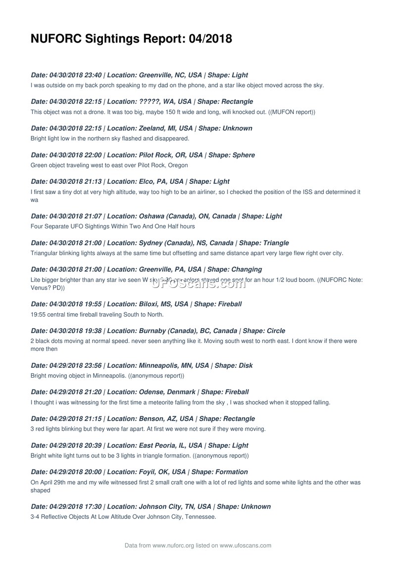 NUFORC Sightings Report: 04/2018
