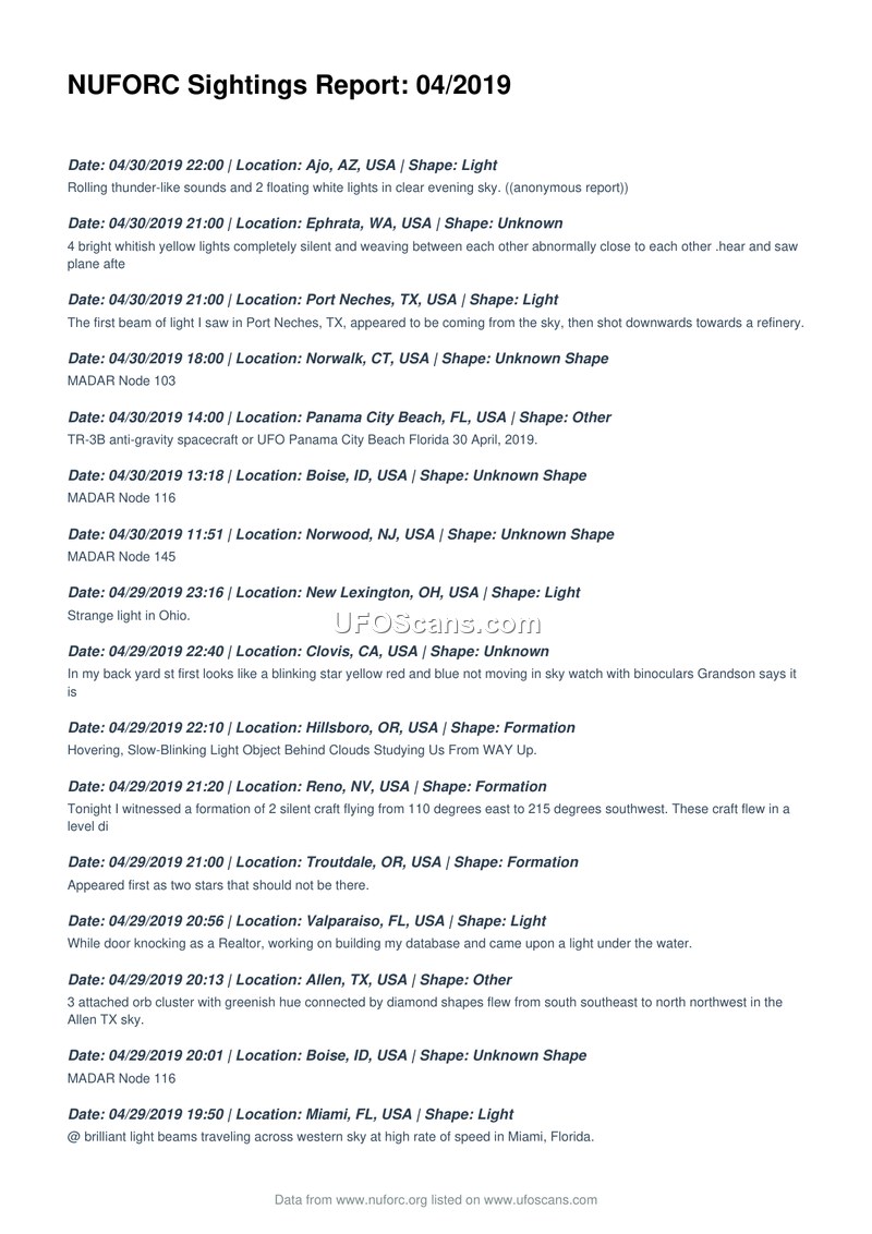 NUFORC Sightings Report: 04/2019