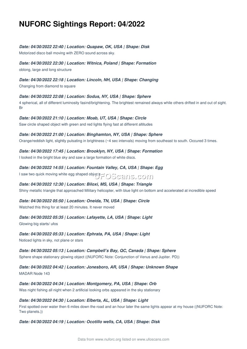 This document is a monthly compilation of public-submitted UAP sighting reports from April 2022, documented by the National UFO Reporting Center. It provides a chronological record of diverse aerial phenomena observed globally, including descriptions of object shapes, behaviors, and occasional technical data from MADAR monitoring nodes.